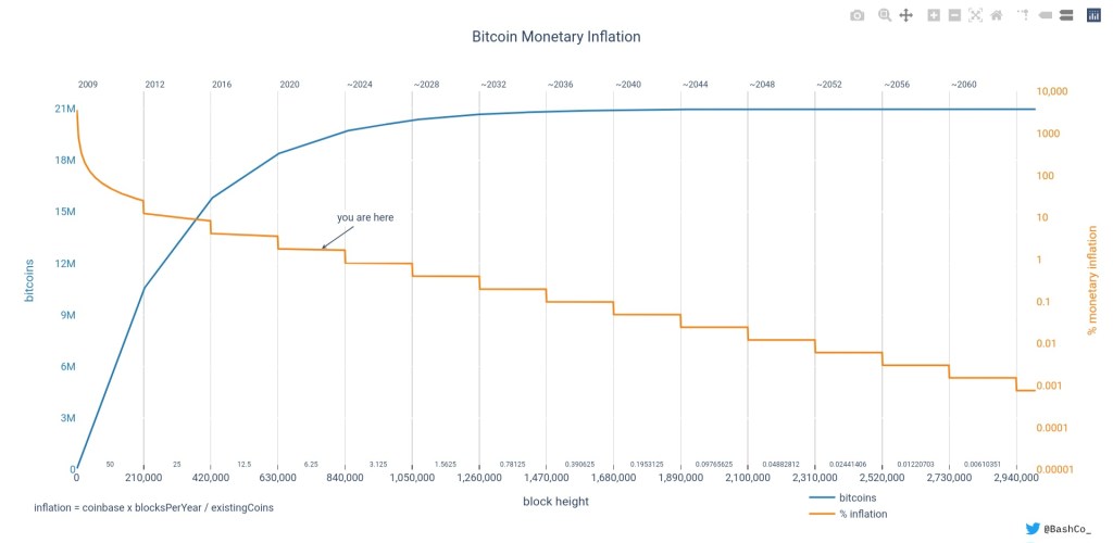 Chart of Bitcoin’s issue schedule, quantity (stock) in blue, and inflation rate (flow) in orange (source)