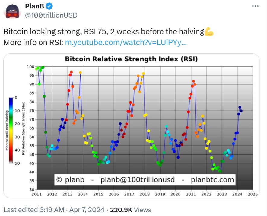 Relative Strength Index (RSI) was another metric I referenced – at a very healthy 75 going into the halving (source)