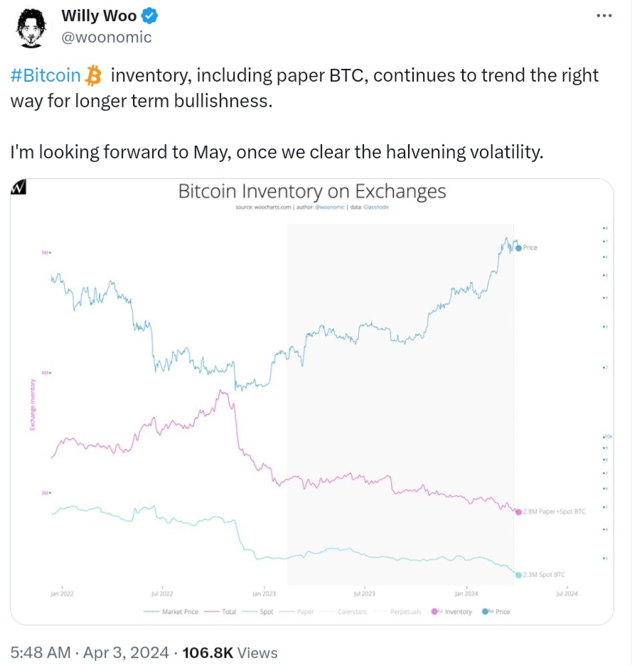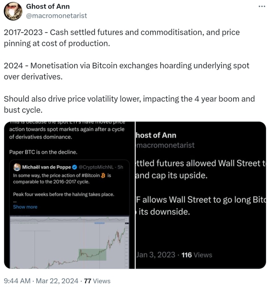 Another reason I believe that we are passed peak Futures price suppression and manipulation, are the recently approved Spot Bitcoin ETF’s. As my above tweet describes, from December 2017 to January 2024 Wall Street basically had a synthetic way to short the Bitcon price via cash settled futures, but there was no effective scalable method for Wall Street to go long the commodity and what would act as a counterveiling force on the gravity of Futures. What ETF’s approved in the second week of January 2024 have enabled, is for Wall Street to hoard and store Spot Bitcoin, taking bitcoins out of active circulation (over 400,000 bitcoins locked in new ETF’s since Jan + another 300,000 left in GBTC) and neuters the previous powers of cash settled and synthetic Futures over the price of Bitcoin. This likely means that the bull market cycle in 2025 will be different from the 2021 Bull Market of 2021, as Wall Street can now go long the commodity on ETF’s to balance out shorting the price via Futures.
