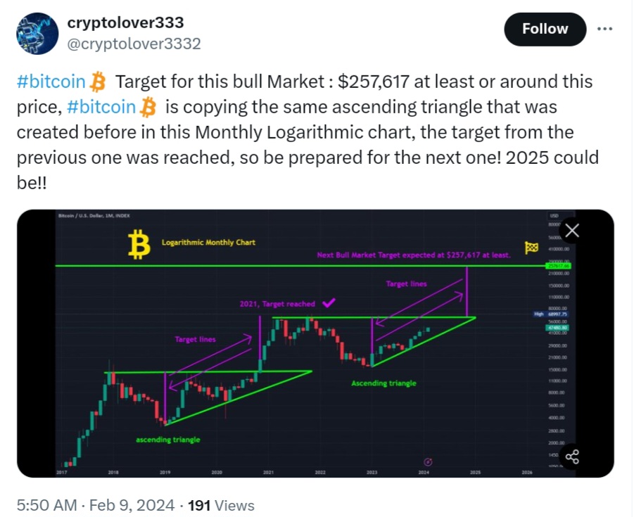 Another tweet estimating a $250,000+ cycle high peak (source)