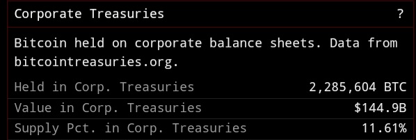 Bitcoin corporate treasuries currently at $144.9 Billion, 2,285,000 bitcoins, or 11.6% of supply, according to bitcointreasuries.net, courtesy of Clark Moody’s Bitcoin Dashboard…