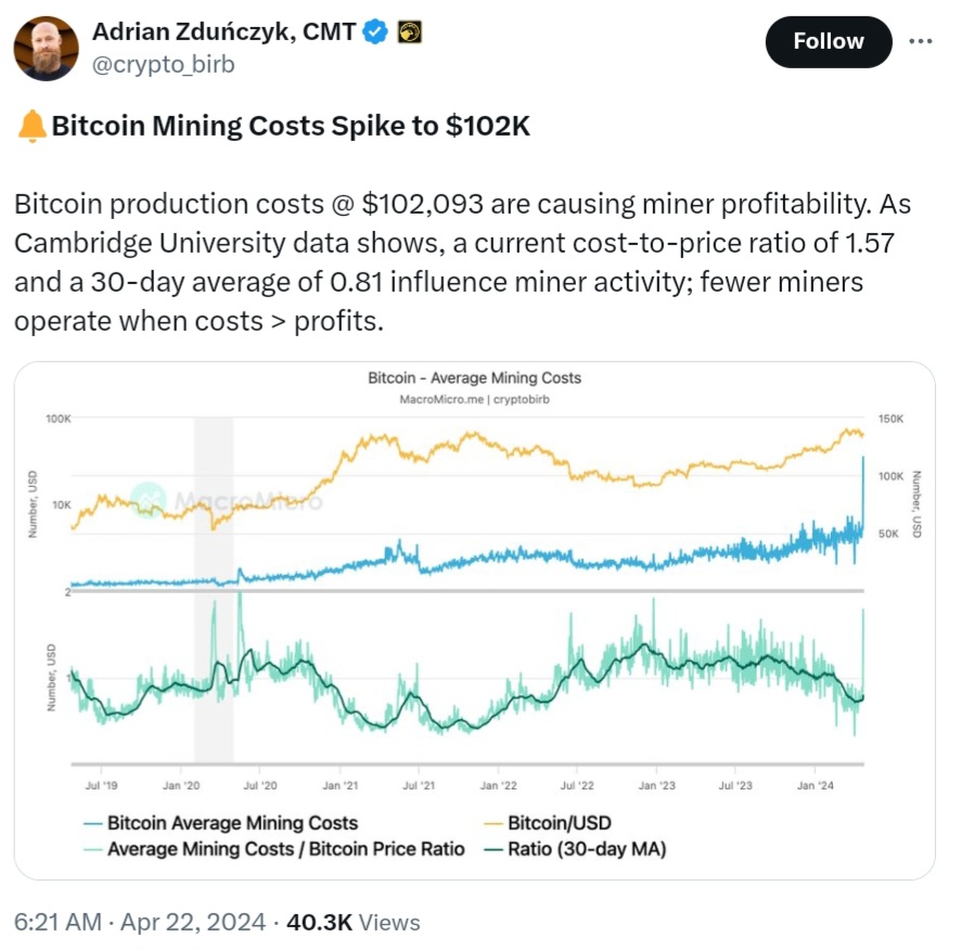 Three days after halving, the production cost of a bitcoin is estimated at $102,000, $35,000 above Bitcoin’s market price! (source)