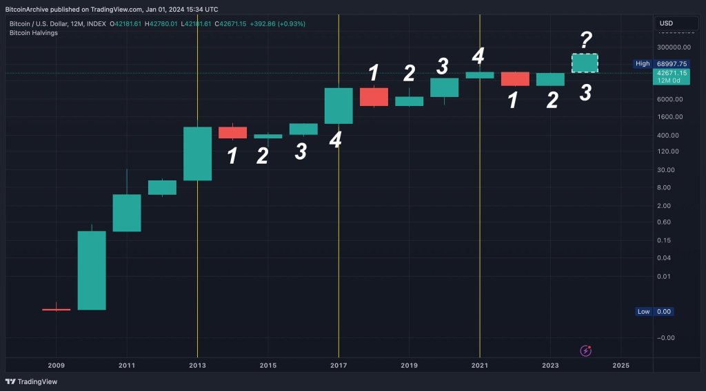 Three green years and one red year have repeated the last three halving cycles. If the historical pattern repeats, 2024 and 2025 will also be 🟢
