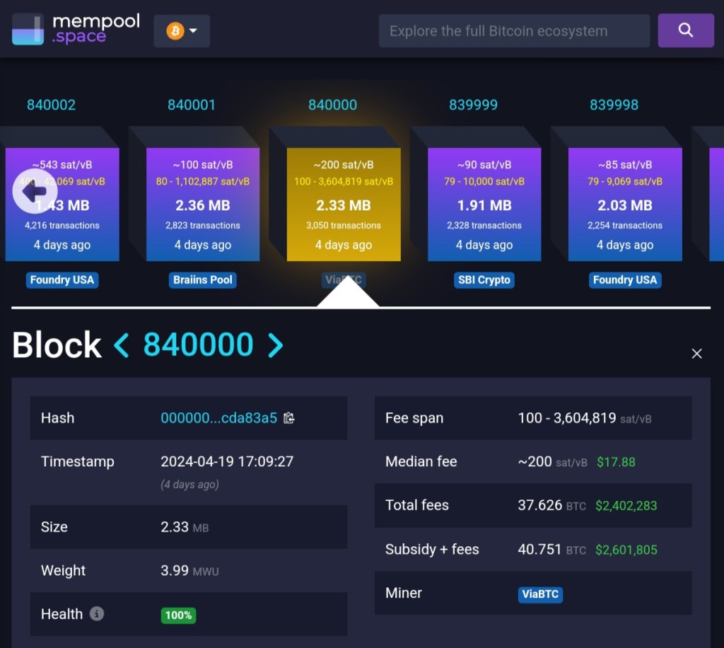 Visualising Bitcoin’s ledger on mempool.space. In block 840,000, the halving block, total fees and the subsidy of 3.125 bitcoin totalled 40.751 btc or over two and a half a million dollars!